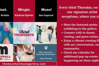 The Marshall Muse Gallery is much more than a traditional art gallery, we are a full creative destination and social space. We proudly feature work from over 90 regional artists already in a short time, with our main gallery changing exhibits every single month, so there’s always something new to discover. Our gallery is 8,700 square feet. Our space also includes: